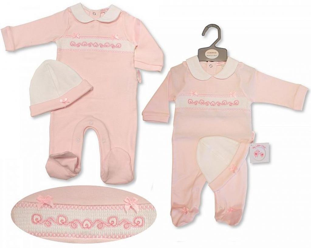 Collared all in one with popper fastening to the back and legs. Smocked panel with "scroll" design.